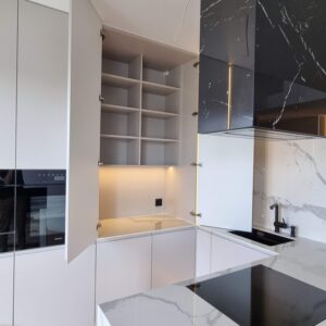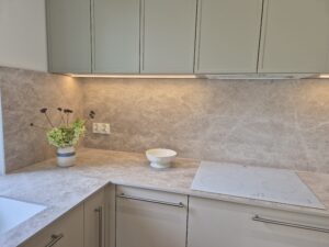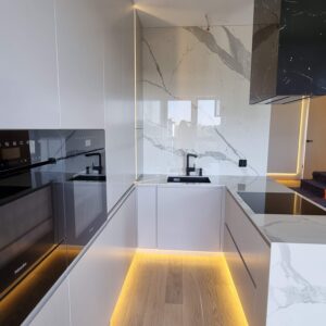 Ścianka przyblatowa to już nie tylko kafle. Producenci płyt oferują ścianki przyblatowe w szerokiej gamie dekorów, tak aby były zintegrowane z dekorem blatu. Panele te są cienkie i trwałe, odporne na temperaturę i zarysowania. Kolejnym rozwiązaniem jest szkło lacobel lakierowane w wybranym kolorze lub z nadrukowaną grafiką oraz spieki kwarcowe. Wszystkie te rozwiązania sprawią, iż kuchnia nabierze wyrazistości dekorów — jest to nieodzowny element, który nadaje wyjątkowy charakter Twojej wymarzonej kuchni.